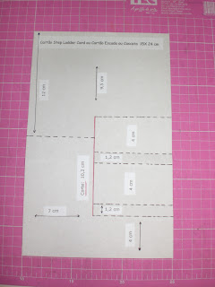 Na foto o cartão com as medidas, linhas pontilhadas para as dobras e linha vermelha recortar. Clique na imagem para ampliar!